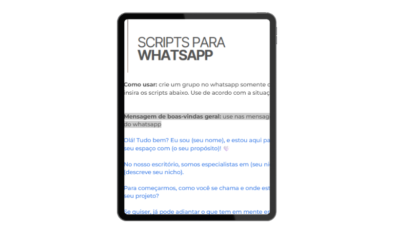 Tenha scripts prontos, do primeiro atendimento, até objeções de orçamento e boas-vindas do cliente no seu escritório!